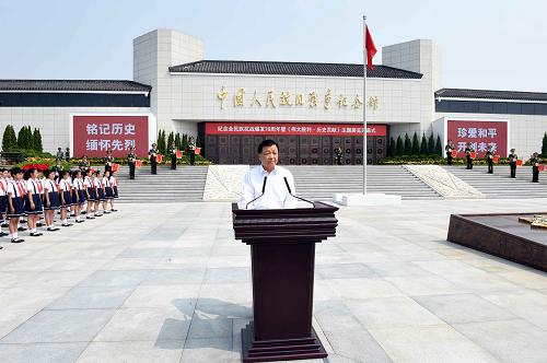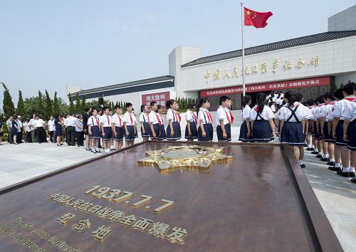 位于北京卢沟桥畔的中国人民抗日战争纪念馆庄严雄伟。上午10时,中国人民解放军军乐团奏响《义勇军进行曲》,全场高唱中华人民共和国国歌。随后,全场肃立,向在中国人民抗日战争中英勇牺牲的烈士默哀。