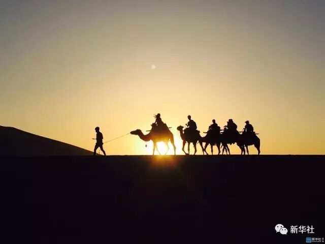 2016年6月15日,在甘肃省敦煌市鸣沙山拍摄的驼队。新华社发