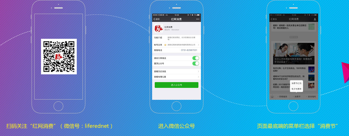 活动介绍:在湖南省第三届金秋购物消费节期间,"红网消费"微信公众号将有部分商家优惠券提供给网友随时领取。进入微信号后,在菜单栏的"消费节——优惠券",点击任意你钟意的商家,即可领取对应商家门店的优惠券;活动期间,所有人将可免费领取优惠券,每天有固定的领取优惠券数量;优惠券可在商家指定门店使用,可抵扣现金,但不可折现。 |