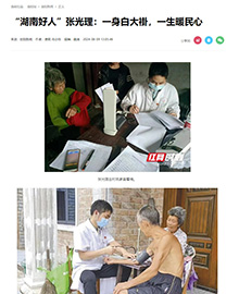 “张医生就是我的家人!”夏先生激动地说。 患有类风湿关节炎、痛风、心脏病等的夏先生是五保户家庭,妻子李女士早些年得了癔症,儿女又常年在外无法及时照顾老人。因此,夏先生早期看病都必须走10多里山路来卫生院诊治,十分不便。近几年病情加重,夏先生瘫痪在床,张光理得知后,第一时间主动申请上门看诊,帮两位老人检查身体。 “病人胜似亲人,我不能辜负他们的信任。”张光理说,“作为医生,一定要对得起自己的病人,尽力去保证他们的健康。”一次,年过八旬的李爹因在家食用南瓜蒌过多出现消化不良现象,多日腹痛便秘,被子女送往卫生院救治。张光理仔细查看症状后认为,清理完堵塞的大便,再使用促消化的药物就可以缓解病情,无需送往上级医院,便让病人儿子手动清理。因气味难闻,儿子无法坚持,这时,张光理来到病床旁,亲自帮老人清理堵塞的肠道。最终,老人的腹痛症状明显缓解,家属们感动不已并向张医生表达了诚挚的感谢。 “我是从农村走出来的,明白老百姓不容易,就想让大家少出钱,看好病。”因为自己淋过雨,所以想替别人撑把伞。张光理自己生活很简朴,却对村民们慷慨大方,每当村民在经济上有困难无法支付起医药费时,他总是设身处地地为村民着想,伸出援手。村民们也将这位年轻的张医生视作一份子,称赞他是“一位好医生,一位真正把村民当亲人的大好人。” “湖南好人”“湖南省最美医生”“医德医风标兵”……尽管获得了越来越多的荣誉称号,而张光理却不曾被浮名牵绊住脚步,专注医学、服务基层,他始终在治病救人的路上。 展望:行医这条路要走到走不动为止