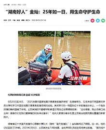 2020年疫情,金灿带领救援队成员携带医疗救援物资紧急支援武汉,活跃在抗疫一线。英国卡迪夫大学及当地华人捐赠的7000余件医疗物资运抵黄花机场,队员们毅然“逆行”,将物资顺利送达湖北黄石中心医院。 2023年2月6日,土耳其发生7.8级强震后,省红十字蓝天救援队受命先后派出2批共11名队员,顶着零下低温跨国驰援。“一落地土耳其,我们就被派往灾情最严重的马拉蒂亚,当地房屋、道路损毁情况远超想象。”金灿回忆,当时救援时间紧任务重,队员们最长连续作业36小时,只为最大程度地挽救生命。 救援现场,一名土耳其军官深受感动,从自己身上摘下肩章送给金灿,象征着两国人民之间深厚的友谊。今年6月在长沙举行的国际红十字救援座谈会上,土耳其消防干警穆罕默德·图尔克再次致谢,以当地最庄重的方式向蓝天救援队行传统“贴额礼”,并与队员们互换肩章袖标。 集结公益人士,传递爱与希望 25年间,累计志愿服务21066小时,开展应急救援知识培训1600余场,受益群体超200万人次……一连串数字无不印证着金灿的大爱。 作为中国红十字会TOT应急救护师、国家应急救援培训师,金灿拥有丰富的专业知识和实战经验。“只有提高公众的安全意识和自救互救能力,在面临突发事件时才能保持冷静,抓住黄金抢救时间。”金灿带领蓝天救援队走进学校、社区、企业和机关,举办各类讲座和培训课程。 从一名退伍军人成长为公益领域的领军人物,金灿以自己的经历鼓舞着每一个愿意伸出援手的人。 蓝天救援队“集结号”吹响后,医生、教师、退役军人、摄影师、户外爱好者等社会爱心人士纷纷响应。截至目前,蓝天救援队已在全省范围内培育了1895名专业救援志愿者。