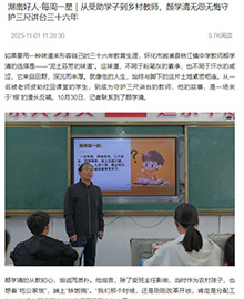 【湖南好人·每周一星】颜学清:一辈子当老师,很幸福 10月23日上午,溆浦县桥江镇中学七年级(8)班教室外,一个清瘦的“小老头”踮着脚朝窗户里打望,看孩子们有没有在专心上课。 “小老头”叫颜学清,是这个班的班主任,没上课的时候,他总是如此打望。“等送这批孩子毕业,我也要退休了。”说话间,颜学清的眼中泛起一丝泪光。 扎根乡村学校36年的颜学清,先后被评为“湖南省优秀教师”“全国模范教师”。今年4月,颜学清获评敬业奉献类“湖南好人”。